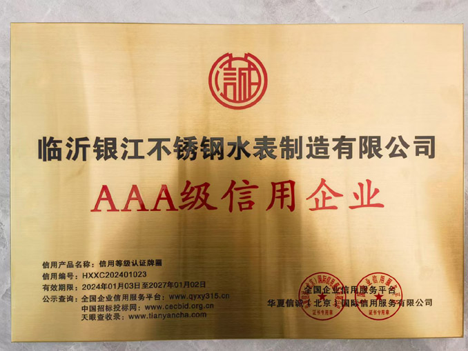| 2024年2月17日,新春開(kāi)工伊始,臨沂銀江不銹鋼水表制造有限公司公司順利通過(guò)三A級(jí)信用企業(yè)認(rèn)證! |