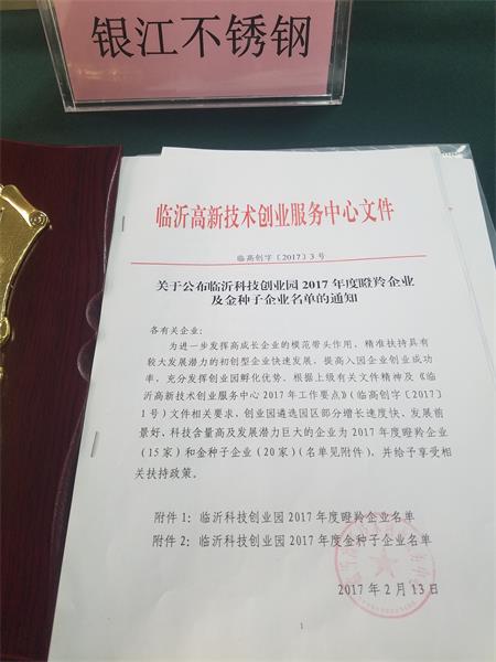 2017年2月23日下午,在臨沂高新技術(shù)開發(fā)區(qū)2017年度創(chuàng)新創(chuàng)業(yè)工作會(huì)議上,我司被臨沂高新區(qū)管委會(huì)評(píng)為臨沂高新區(qū)二零一七年度“金種子”企業(yè)稱號(hào),感謝高新區(qū)領(lǐng)導(dǎo)的信任和厚愛,我司將再接再厲,為臨沂高新區(qū)的發(fā)展做出新的貢獻(xiàn)!