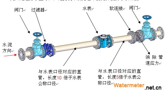 ④對于質(zhì)量超過25KG的水表,應保證進入安裝現(xiàn)場的通道暢通,以便于將水表運進工作位置或移走,工作位置的周圍應留有適當空間用于安裝起重裝置。 (3)正確性 ①水表的安裝須符合其工作方式要求,應在安裝方位、度盤朝向和上下游直管段方面做到符合水表的使用要求。 ②大部分水表邡柑愛皴方法要求,度盤和銘牌上的H代表水平宜挑,V代表垂直安裝,無這兩個符號表示可任愆方向安淡。水襲的度盤應向上,不得傾斜。水裘的濉向應與惜道內(nèi)水的流向保持一致。部分水表(如容秘式水表等)可以任意方向安裝。 ③水表安裝財必須使表殼上的箭頭方向與管道內(nèi)水的流向保持一致,并與管道同軸安裝。 ④水平安裝的水表的度盤一般朝上,不得傾斜。不能為讀數(shù)方便而調(diào)整讀數(shù)水表指示度盤的朝向。(有些干式水表的讀數(shù)指示器可以360旋轉以方便讀數(shù)。)水表在垂直或傾斜安裝時,葉輪軸與管道中心線必須保持平行,不得發(fā)生偏角。 ⑤水表上下游的直管段必須符合使用說明書的要求,對速度式水表來說更要注意這一點。一般來說,水平螺翼式水表和單流束式水表對直管段的要求更為敏感。通常水表的進水口側直線管段的長度,不得小于水表口徑的10倍;出水口側直線管段的長度,不得小于水表Vl徑的5倍。 ⑥水表下游應有任何一處的管線位置高于水表位置(如水龍頭)或保持一定的壓力,以保證水表在滿管流的條件下工作。 |